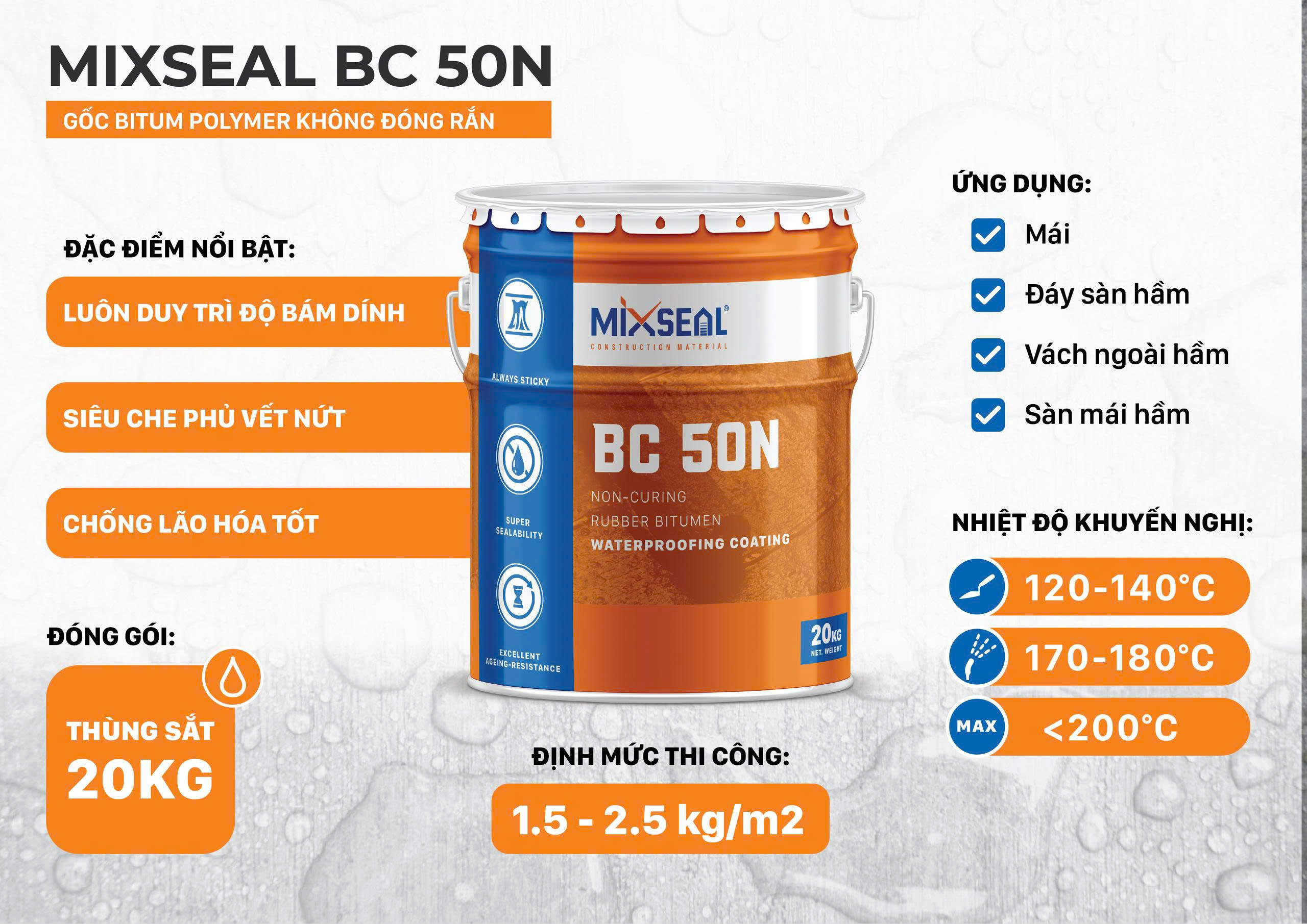 Mixseal BC50N là chất phủ chống thấm đàn hồi bitum biến tính polyme nóng chảy. Duy trì trạng thái dính, gel mà không bị khô cứng hãy lão hóa theo thời gian. Với đặc tính tự phục hồi, độ bám dính tức thì khi tiếp xúc, khả năng chống bong tróc cao. Có thể thi công bằng bay, phun nóng và có độ tương thích cao với các hệ thống màng gốc bitum.